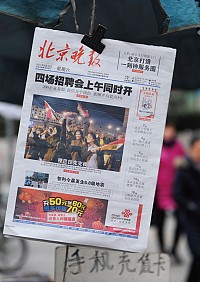 对于埃及总统穆巴拉克下台的消息,中国官方媒体和门户网站都做了报导,但“埃及穆巴拉克”相关的内容仍在微博被禁止。图为《北京晚报》12日头版。(AFP/Getty Images